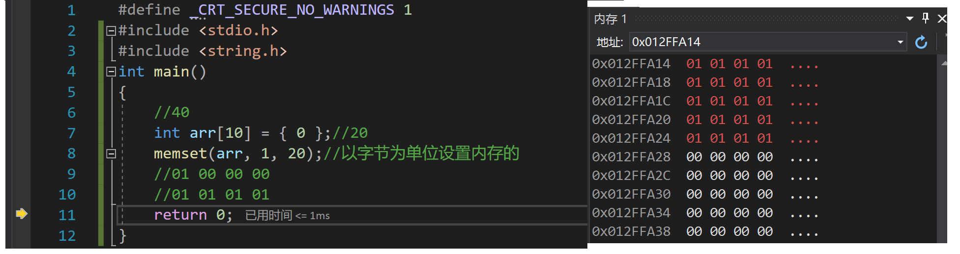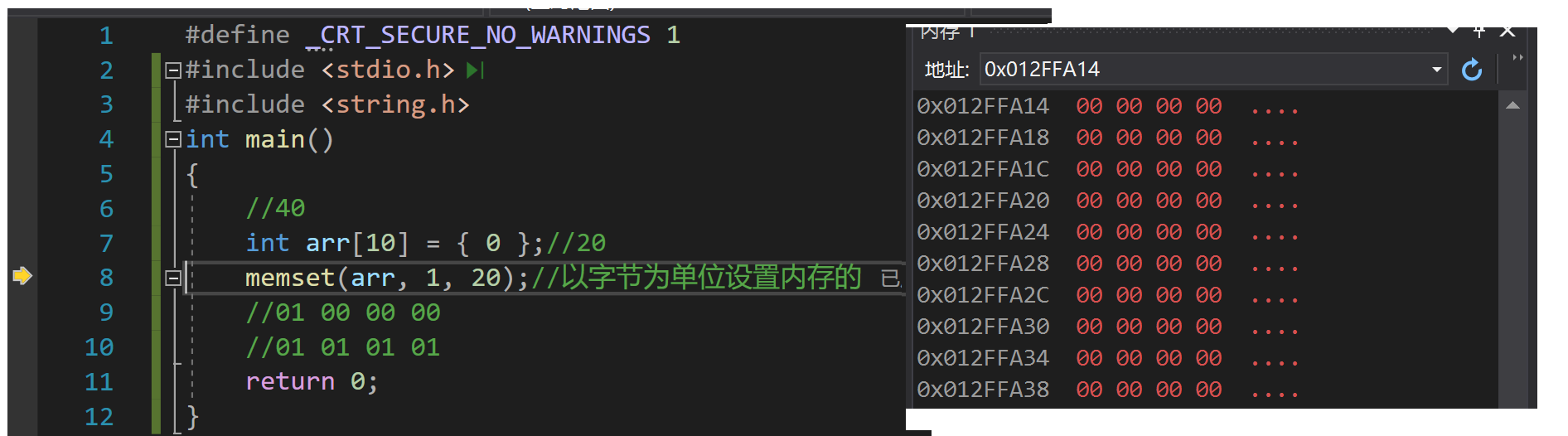 memset(arr, 1, 20);//以字节为单位设置内存的