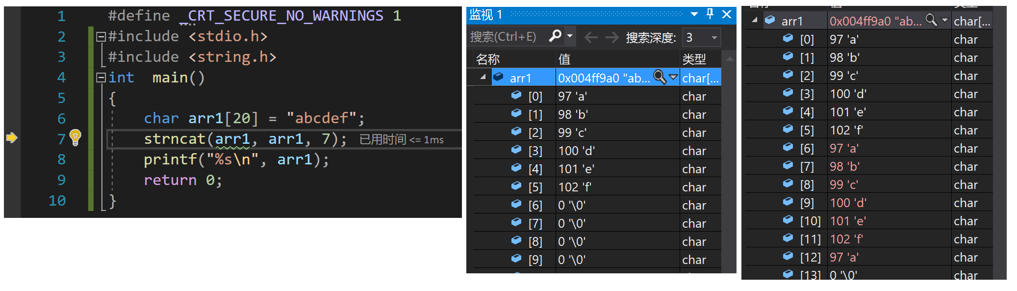 - ?strcat这个库函数是不能自己追加自己的,因为如果自己追加自己,会找不到\0,导致无法结束,