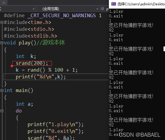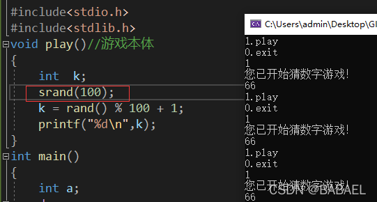 我们便可知:当srand的括号中出现一个值时便会产生一个对应的随机的值