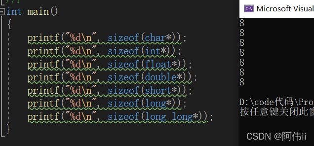 可见,指针大小均为8字节,指针大小是相同的,这是因为指针是用来存放地址的,指针需要多大空间取决于地址存储需要多大空间;比如32位机器指针大小就是4字节,64位机器指针大小就是8字节。