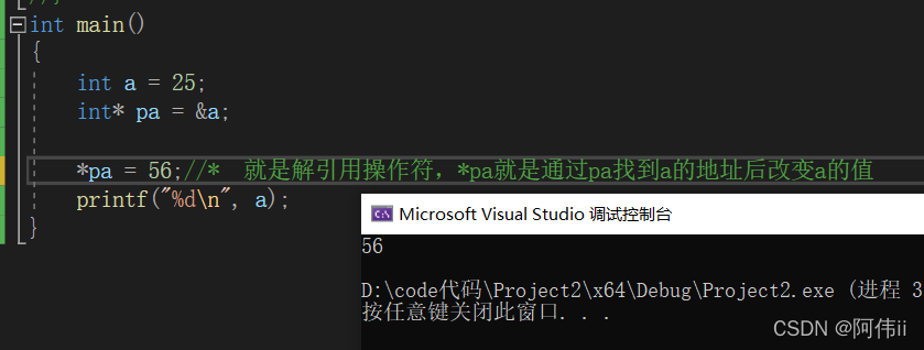 *pa = 56;//* 就是解引用操作符,*pa就是通过pa找到a的地址后改变a的值