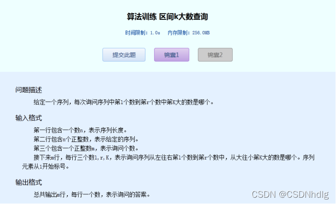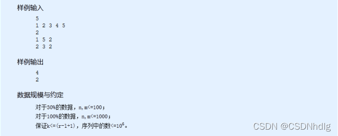 #include<stdio.h> int main() { ? ? int i,n,a[100],b[100],c[100]; ? ? scanf("%d",&n); ? ? for(i=1;i<=n;i++) ? ? ? ? scanf("%d",&a[i]); ? ? int m; ? ? scanf("%d",&m); ? ? int l,r,k,max,j,q,w,cnt=0; ? ? for(q=1;q<=m;q++){ ? ? ? ? scanf("%d%d%d",&l,&r,&k); ? ? ? ? for(w=l;w<=r;w++) ? ? ? ? ? ? c[w]=a[w]; ? ? ? ? for(i=l;i<=r;i++){ ? ? ? ? ? ? for(j=i+1;j<=r;j++){ ? ? ? ? ? ? ? ? max=c[i]; ? ? ? ? ? ? ? ? if(c[i]<c[j]){ ? ? ? ? ? ? ? ? max=c[j]; ? ? ? ? ? ? ? ? c[j]=c[i]; ? ? ? ? ? ? ? ? c[i]=max; ? ? ? ? ? ? ? ? } ? ? ? ? ? ? } ? ? ? ? } ? ? ? ? b[++cnt]=c[l+k-1]; ? ? } ? ? for(i=1;i<=m;i++) ? ? ? ? printf("%d\n",b[i]); ? ? return 0; } ?