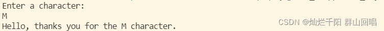 cout << "Hello, thanks you for the " << ch << " character." << endl; //cout将77转换为M,cin和cout的行为由变量类型引导