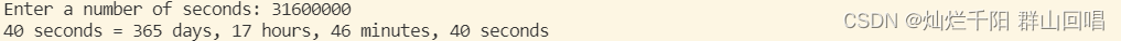 cout << seconds << " seconds = " << days << " days, " << hours << " hours, " << minutes << " minutes, " << seconds << " seconds " << endl;