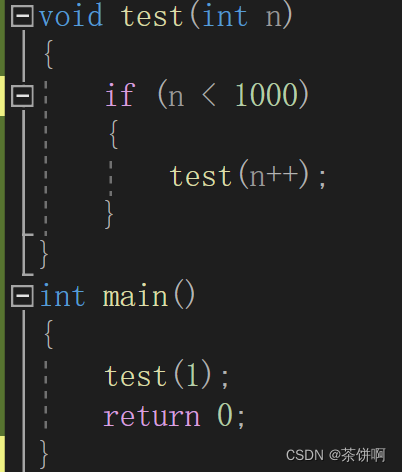 ??这个时候便会报错 ,提示 stack overflow(栈溢出),因为每一次调用test函数栈区都要给它分配空间,而且上一次调用并没有结束,调用的次数太多,栈区的内存不够分配了,便会出现栈溢出的情况。