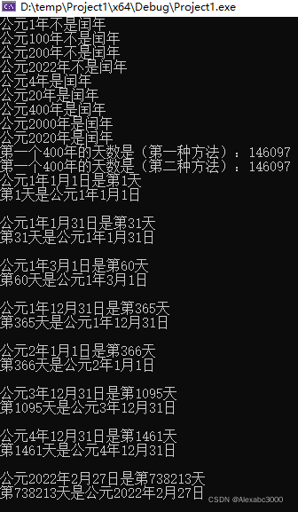 std::cout << "第一个400年的天数是(第二种方法):" << (24 * 366 + 76 * 365) * 3 + 25 * 366 + 75 * 365 << std::endl;