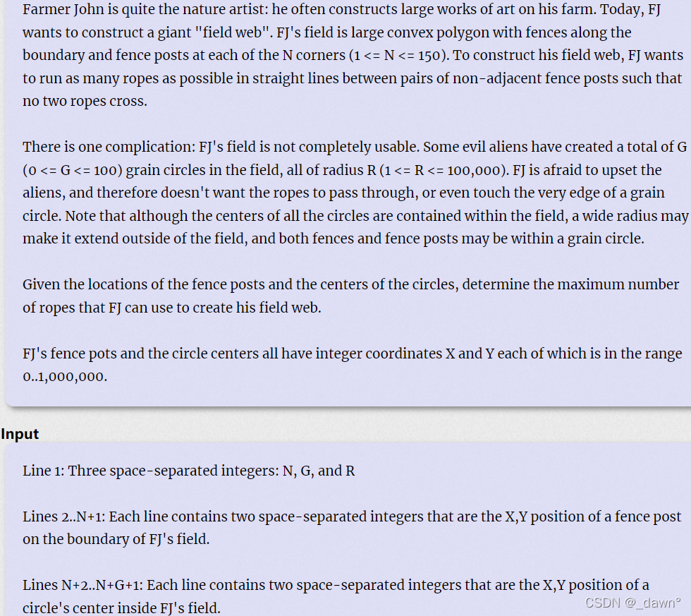 思路:看题意像是一个几何题。先考虑怎样不连接怪圈上的绳索。即怪圈圆心到每一条绳索的最短距离要大于半径,那么就是预处理点到线段距离,之前的题里有一个涉及到的。剩下的就要求怎样连接可以连接最多,即DP问题,则考虑区间DP。区间DP部分不算难写,但是主要是预处理部分要考虑,最后就是要满足不能交叉。