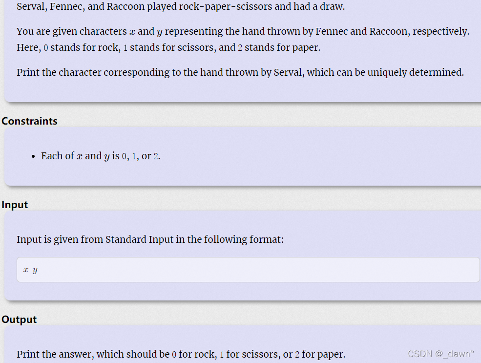 三人剪子包袱锤打成平局,给出其中两个人的选择,问第三个人的选择。