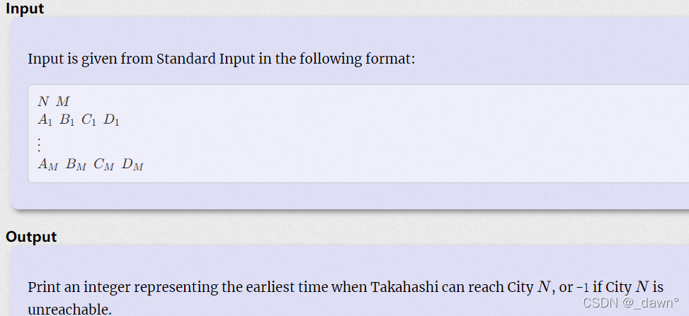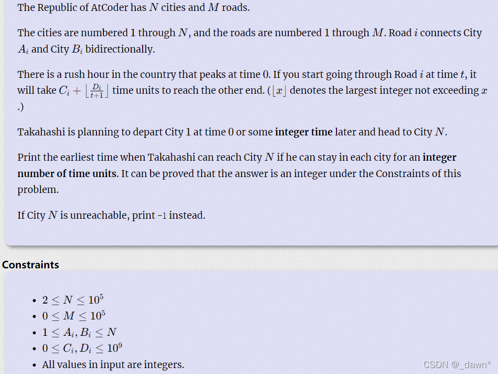 给定四个数,由A到B,所用时间为C,因为traffic jam,还需要一个时间是 ,t是离开时间,问1~N的最短时间。