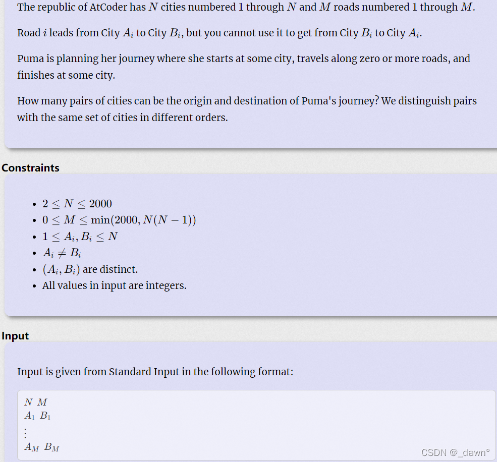 给出n个城市,m条单向道路,问可以作为起点和终点的城市组有几对。