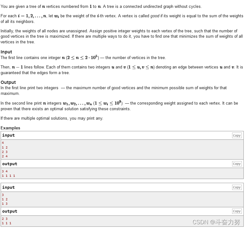 D. Weight the Tree  题意:给定一颗由n个节点构成的树,一个好节点的定义是其值等于所有与其相邻的节点的价值和。 输出最多有多少好节点,在此基础上保证总价值最小,同时输出每个节点的价值 思路:树形dp,