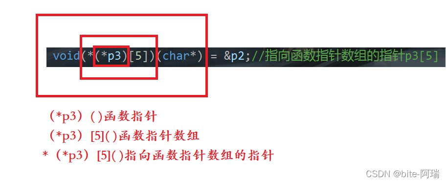 void(*(*p3)[5])(char*) = &p2;//指向函数指针数组的指针p3[5]