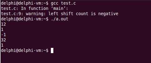 ? ? ? ? ?注意四则运算优先级大于位运算,所以 0x01 << 2 + 3 的结果是 32。 还有就是右操作数的范围必须为:[0,31],如果不在这个范围内,程序的输出结果由不同类型的编译器所决定,结果将不确定,就像本代码 3 << -1 一样。
