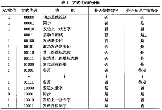 模式(方式)码由标准定义,为总线控制器提供数据总线管理和错误处理/恢复能力,T/R位决定数据字是由远程终端传输还是接收。 1 总线控制器向远程终端的数据传输 总线控制器发出一个接收命令字及规定数目的数据字到远程终端,远程终端在核实消息之后,应发回一个状态字给控制器。其中,命令字和数据字之间以没有字间间隔的连续形式发出。 2 远程终端向总线控制器的数据传输 总线控制器向远程终端发出一个发送命令字,远程终端在核实命令字后,应发回一个状态字给总线控制器,继之以规定数目的数据字。其中,状态字与数据字之间以没有字间隔的连续形式发出。 3 远程终端向远程终端的数据传输 略。