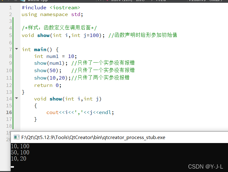 总结:上述实验说明,在使用默认参数值时,若存在函数声明和定义操作,则需要在函数声明时把默认值写上,而不是在定义的时候写上,在定义时写上并没有用,因为程序由上至下执行,先执行声明处再是定义处;而当函数定义在调用调用前面,程序不需要声明时,直接在函数定义处对函数默认参数赋值就行了,因为此时函数对其以下的程序相当于即做了定义也做了声明。