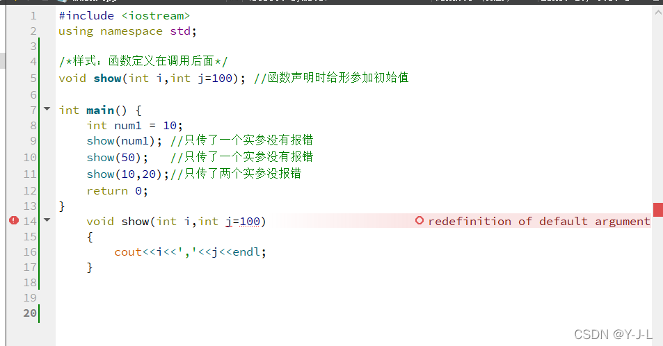 ?3)函数声明时写入默认参数值,在定义时也写入默认参数值。可以看到编译器提示了错误,说对默认参数值进行了重复赋值操作,编译不通过。因为前面对函数声明时进行了默认参数的赋值,在定义函数时又对函数进行默认参数赋值操作,造成了重复赋值,所以报错。