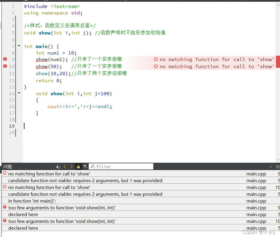因为show(int i,int j);声明被编译器处理后是show_int_int的函数格式,而调用函数show(num1)和show(50)调用的是show_int格式的函数,相当于是show函数的重载函数,而我们并没有定义这一个重载函数,所以报错说找不到对应的函数。而show(10,20)对应的就是show_int_int这个函数,所以不会报错。