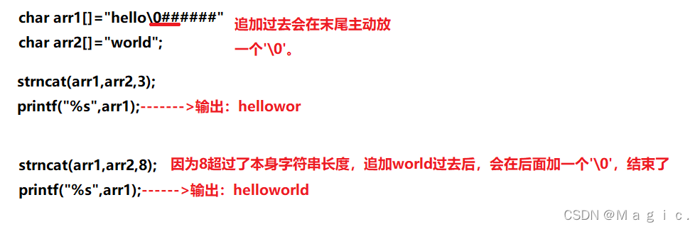 注:与strcat不一样的地方是:strcat是将整个字符串全部追加过去,而strncat是可以指定多少个字符进行追加。如果源字符串长度小于num,则追完源字符串之后,在目标的后面追加一个'\0',就结束了。