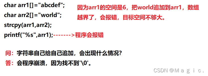 2. strcat 功能:追加全部字符到字符串------>char* strcat(char* destination,const char* source)