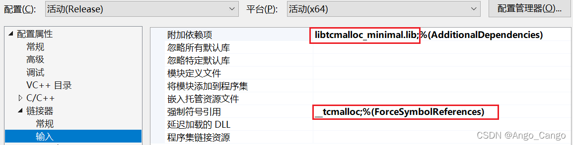 新建工程,配置工程属性,附加依赖项中增加 libtcmalloc_minimal.lib,强制符号引用增加 __tcmalloc 项,即可在工程中使用被改造后的 malloc 和 new 来申请内存空间。