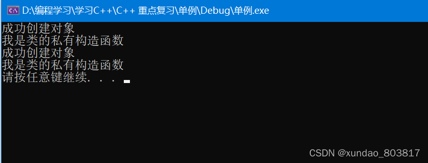 cout << "已经有一个对象了,不能在进行创建新的对象了,请释放当前对象,已达到再一次创建对象目的\n";