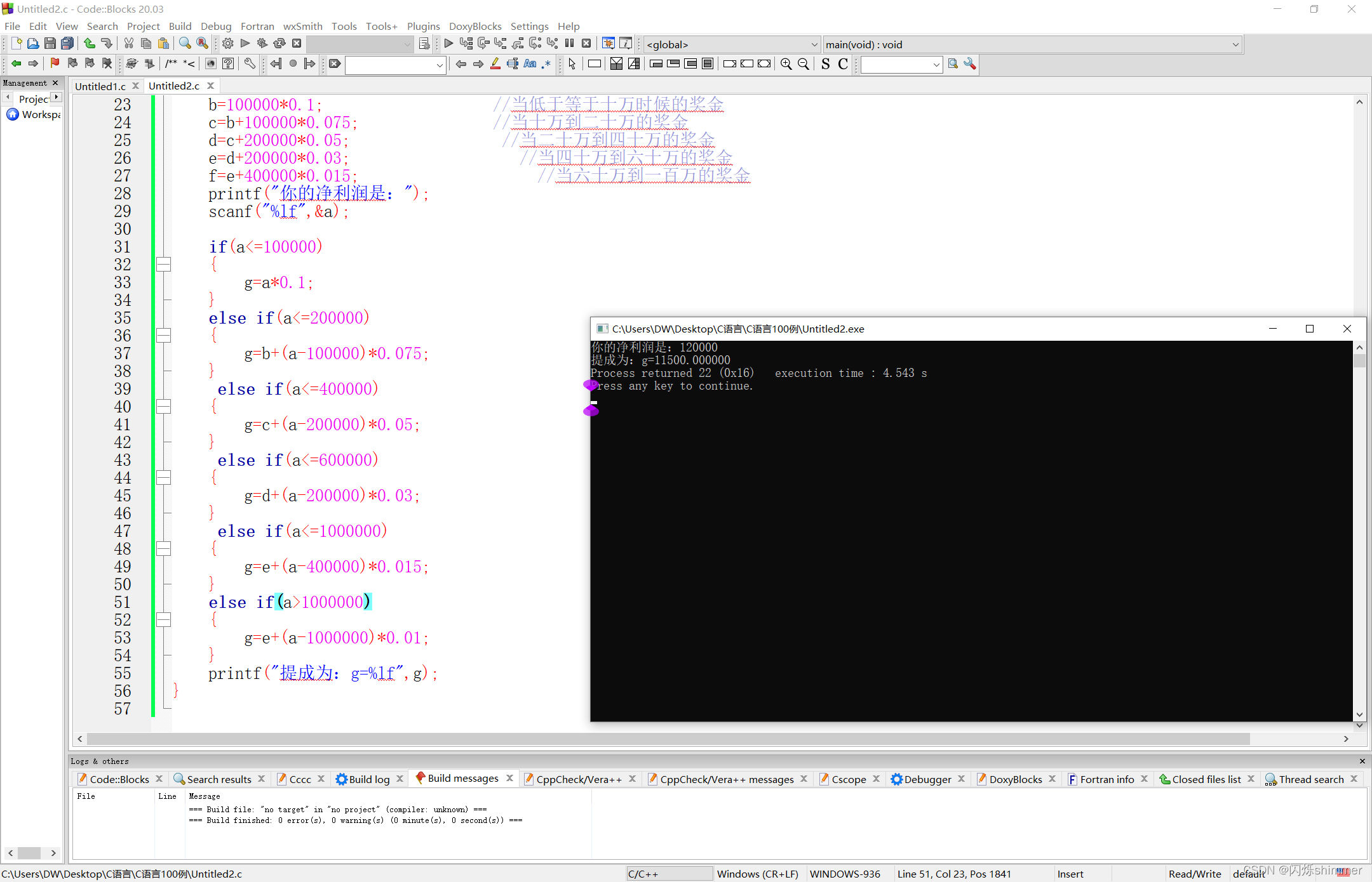 void main(void) { ? ? double a; ? ? ? ? ? ? ? ? ? //先定义输入常量 ? ? double b,c,d,e,f,g; ? ? ? ? ? //定义各种情况得到的奖金 ? ? b=100000*0.1; ? ? ? ? ? ? ? ? ? //当低于等于十万时候的奖金 ? ? c=b+100000*0.075; ? ? ? ? ? ? ? //当十万到二十万的奖金 ? ? d=c+200000*0.05; ? ? ? ? ? ? ? ? //当二十万到四十万的奖金 ? ? e=d+200000*0.03; ? ? ? ? ? ? ? ? ? //当四十万到六十万的奖金 ? ? f=e+400000*0.015; ? ? ? ? ? ? ? ? ? ?//当六十万到一百万的奖金 ? ? printf("你的净利润是:"); ? ? scanf("%lf",&a);