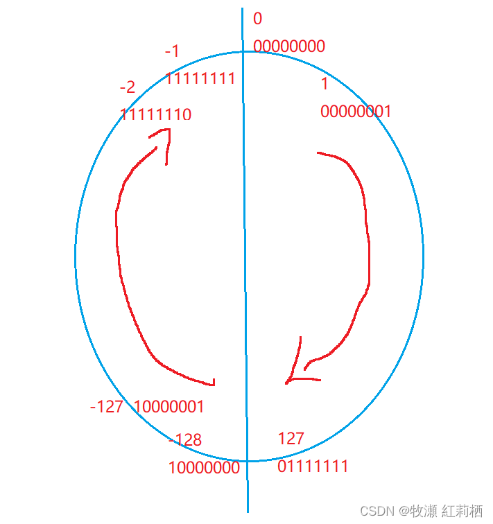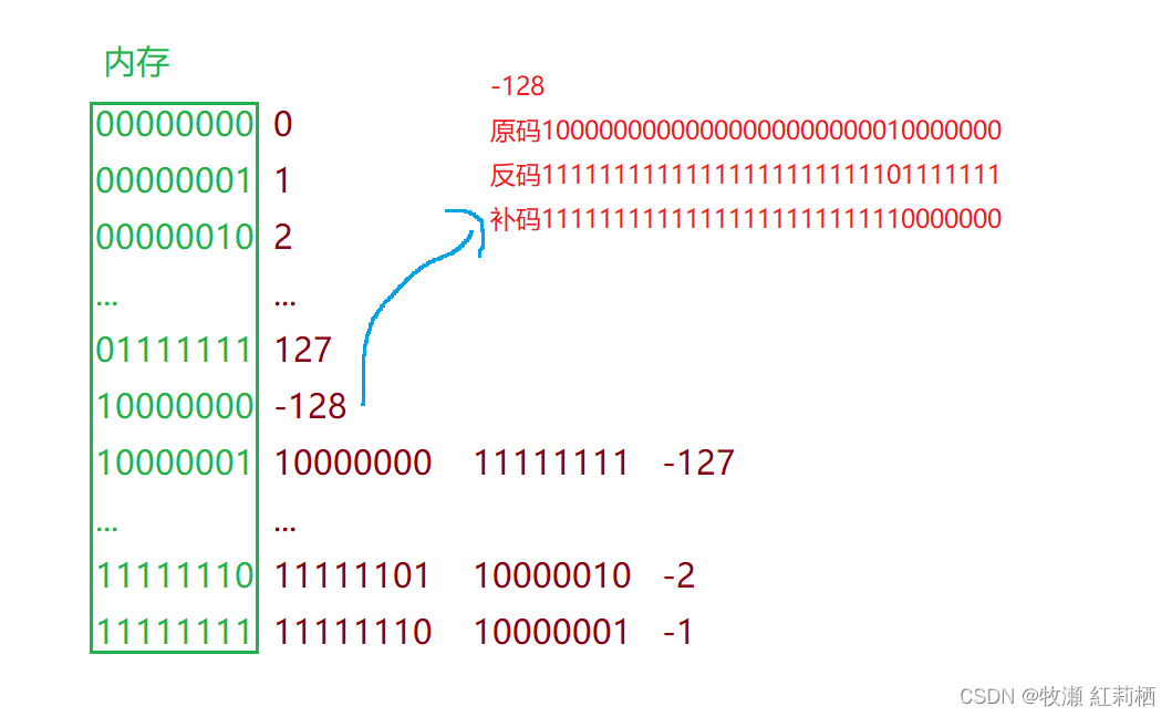 char 类型内存存储。 127 再加 1 会变成 -128。 之后的 -127,-126都有迹可循,但是 -128 会复杂一些,需要查看补码反码原码。