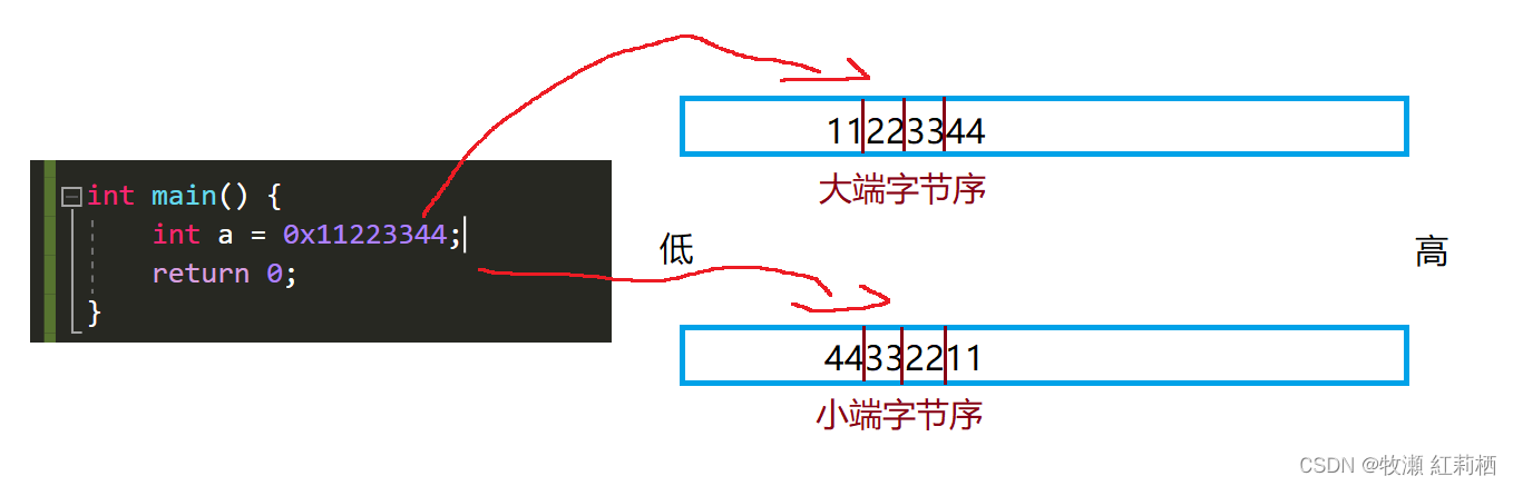大端字节序: 把数据的低位字节序的内容存放在高地址处,高位字节序的内容存放在低地址处。