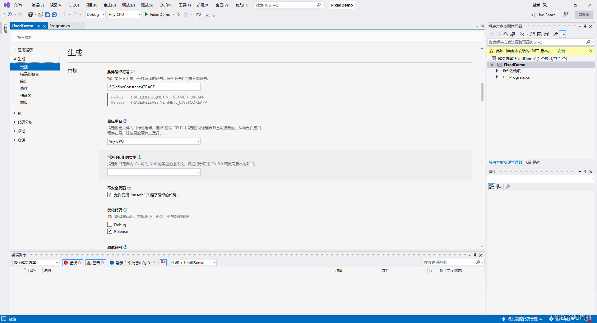 右键FixedDemo项目,选择属性,勾选“允许使用unsafe关键字编译的代码”。