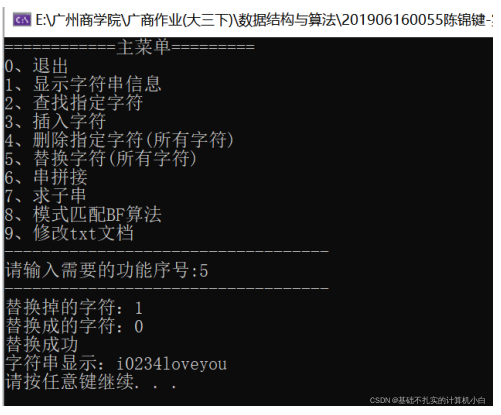 (5) 将字符串中的某个字符替换成指定字符,如把所有的字符a替换成c。