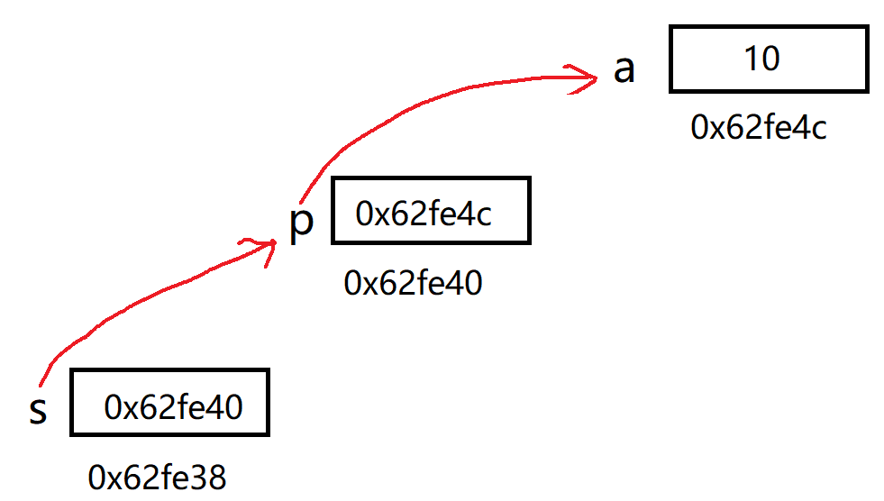 ????????此时指针变量p的两个值分别是,p的值:0x62fe4c,p指向的值:10(变量a的值)。 ????????指针变量s