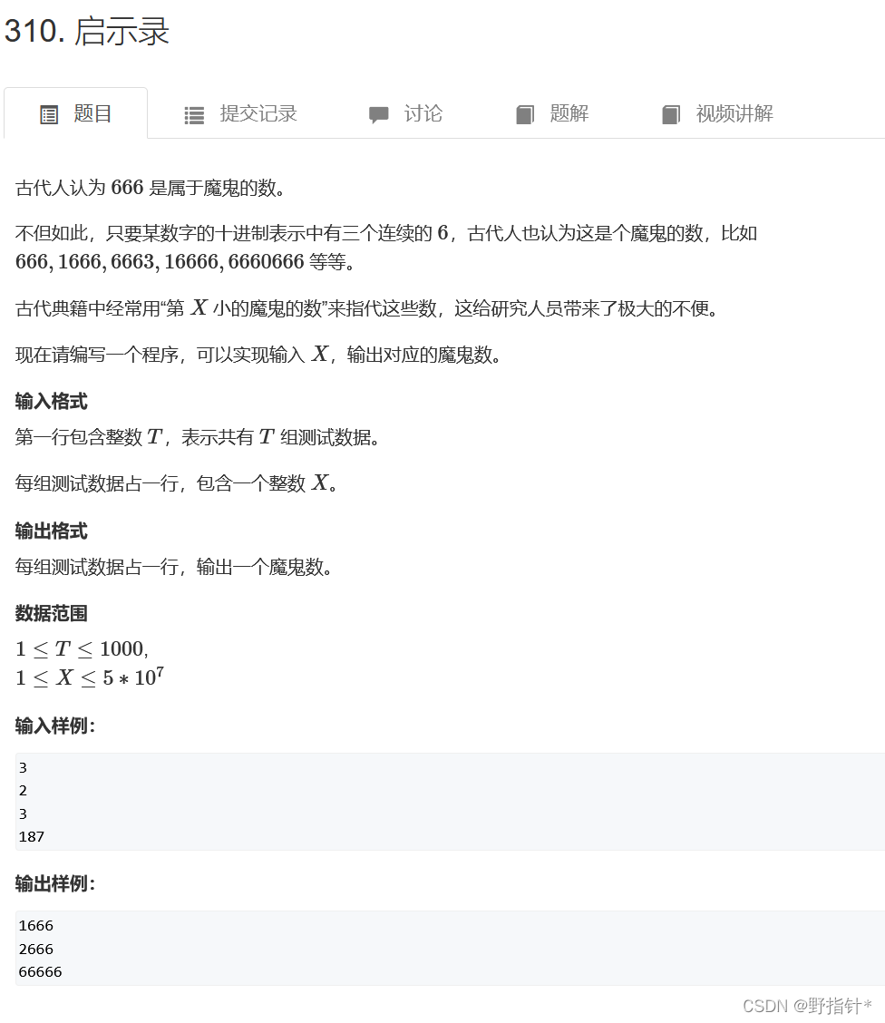 首先,我们用动态规划预处理出一个辅助数组 和 ,前者表示有i位,且从最高位开始数起,有连续(0 / 1 / 2)个6的方案数,注意!这个方案数是包含前导0的!后者则表示i位数字下有多少数字是有连续的666存在的(注意不一定是魔鬼数, 因为魔鬼数没有前导0)