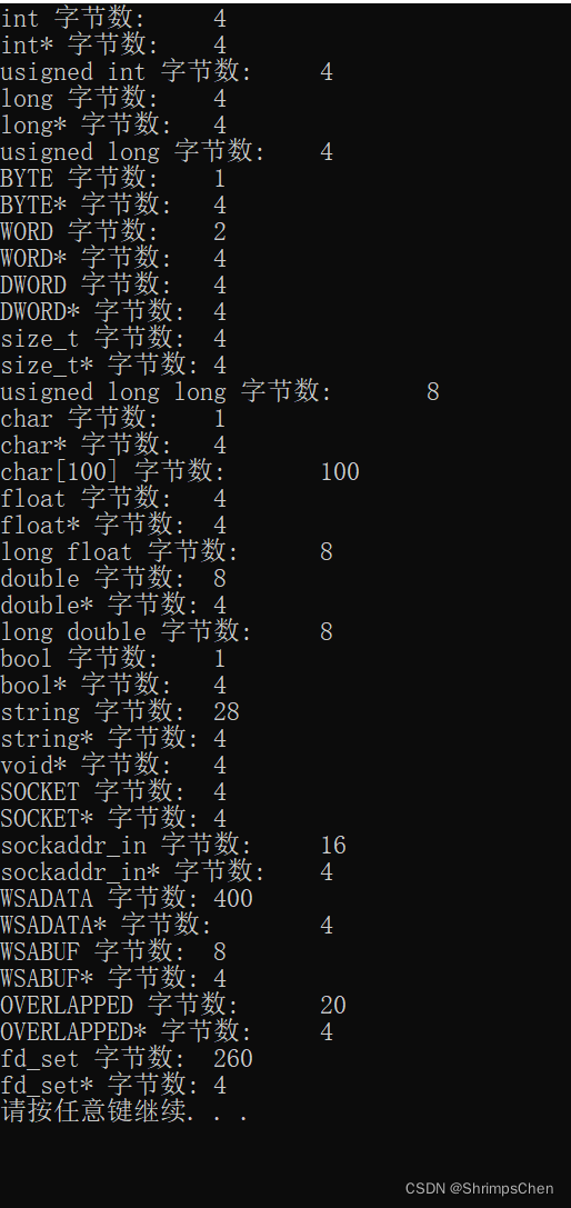 printf("int 字节数:?? ?%d\n", sizeof(int)); ?? ?printf("int* 字节数:?? ?%d\n", sizeof(int*)); ?? ?printf("usigned int 字节数:?? ?%d\n", sizeof(unsigned int)); ?? ?printf("long 字节数:?? ?%d\n", sizeof(long)); ?? ?printf("long* 字节数:?? ?%d\n", sizeof(long*)); ?? ?printf("usigned long 字节数:?? ?%d\n", sizeof(unsigned long)); ?? ?printf("BYTE 字节数:?? ?%d\n", sizeof(BYTE)); ?? ?printf("BYTE* 字节数:?? ?%d\n", sizeof(BYTE*)); ?? ?printf("WORD 字节数:?? ?%d\n", sizeof(WORD)); ?? ?printf("WORD* 字节数:?? ?%d\n", sizeof(WORD*)); ?? ?printf("DWORD 字节数:?? ?%d\n", sizeof(DWORD)); ?? ?printf("DWORD* 字节数:?? ?%d\n", sizeof(DWORD*)); ?? ?printf("size_t 字节数:?? ?%d\n", sizeof(size_t)); ?? ?printf("size_t* 字节数:?? ?%d\n", sizeof(size_t*)); ?? ?printf("usigned long long 字节数:?? ?%d\n", sizeof(unsigned long long)); ?? ?printf("char 字节数:?? ?%d\n", sizeof(char)); ?? ?printf("char* 字节数:?? ?%d\n", sizeof(char*)); ?? ?printf("char[100] 字节数:?? ?%d\n", sizeof(char[100])); ?? ?printf("float 字节数:?? ?%d\n", sizeof(float)); ?? ?printf("float* 字节数:?? ?%d\n", sizeof(float*)); ?? ?printf("long float 字节数:?? ?%d\n", sizeof(long float)); ?? ?printf("double 字节数:?? ?%d\n", sizeof(double)); ?? ?printf("double* 字节数:?? ?%d\n", sizeof(double*)); ?? ?printf("long double 字节数:?? ?%d\n", sizeof(long double)); ?? ?printf("bool 字节数:?? ?%d\n", sizeof(bool)); ?? ?printf("bool* 字节数:?? ?%d\n", sizeof(bool*)); ?? ?printf("string 字节数:?? ?%d\n", sizeof(std::string)); ?? ?printf("string* 字节数:?? ?%d\n", sizeof(std::string*)); ?? ?printf("void* 字节数:?? ?%d\n", sizeof(void*)); ?? ?printf("SOCKET 字节数:?? ?%d\n", sizeof(SOCKET)); ?? ?printf("SOCKET* 字节数:?? ?%d\n", sizeof(SOCKET*)); ?? ?printf("sockaddr_in 字节数:?? ?%d\n", sizeof(sockaddr_in)); ?? ?printf("sockaddr_in* 字节数:?? ?%d\n", sizeof(sockaddr_in*)); ?? ?printf("WSADATA 字节数:?? ?%d\n", sizeof(WSADATA)); ?? ?printf("WSADATA* 字节数:?? ?%d\n", sizeof(WSADATA*)); ?? ?printf("WSABUF 字节数:?? ?%d\n", sizeof(WSABUF)); ?? ?printf("WSABUF* 字节数:?? ?%d\n", sizeof(WSABUF*)); ?? ?printf("OVERLAPPED 字节数:?? ?%d\n", sizeof(OVERLAPPED)); ?? ?printf("OVERLAPPED* 字节数:?? ?%d\n", sizeof(OVERLAPPED*)); ?? ?printf("fd_set 字节数:?? ?%d\n", sizeof(fd_set)); ?? ?printf("fd_set* 字节数:?? ?%d\n", sizeof(fd_set*));