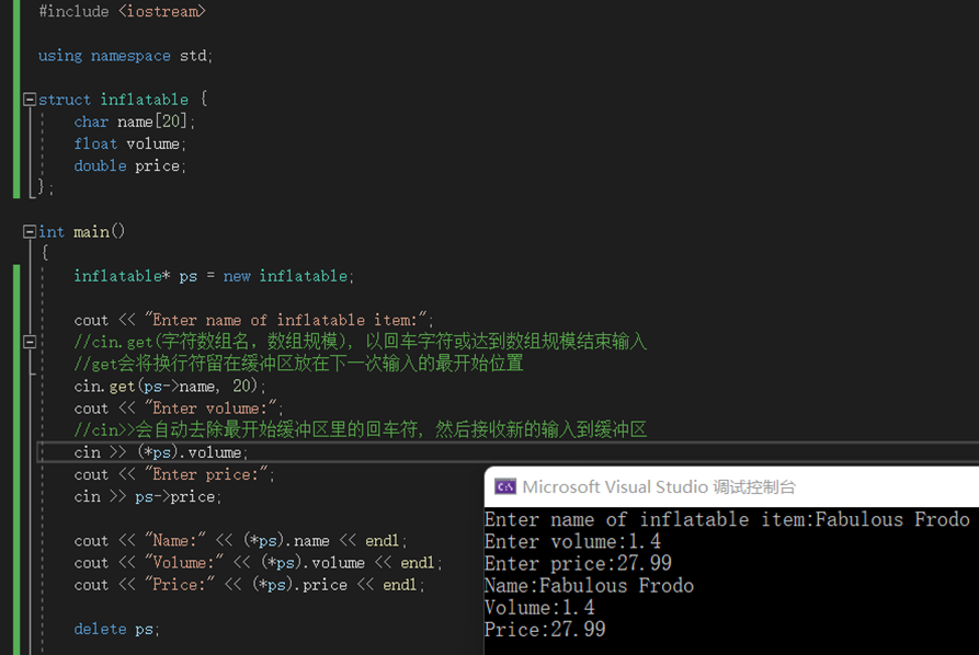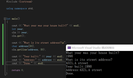 字符串示例:  如果把cin.get()注释了:  我们发现不能输入address,这是因为,当我们输入year后,还有一个回车,这个回车被保留在输入队列,cin.getline(address,80)首先读入回车,误认为已经结束输入。