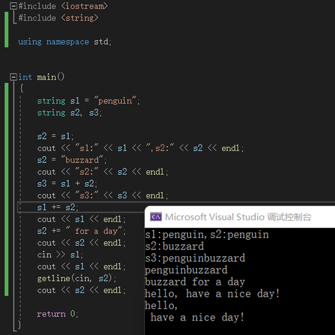 字符串示例:  可以看到,std::getline(cin, str)也是从缓冲区读,也是先读入了cin>>处引入的空格字符,如果我们在cin>>s1时,最后采用换行,那么getline将读到换行,误认为结束。