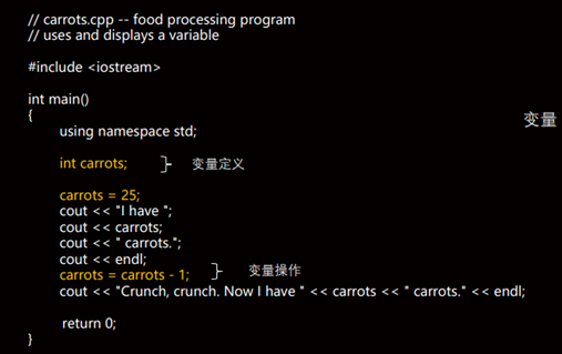 同样看下面示例:  多了一个变量:程序运行中可以变化的值,变量必须占有存储空间。 变量定义:为变量准备存储空间,为编译器检查变量使用是否正确提供依据。定义格式:”类型 变量列表”,比如int carrots。变量必须先定义再使用。