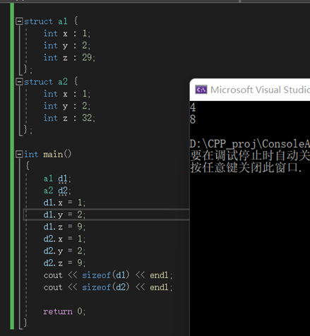 我们可以定义结构变量,也可以定义结构数组:book book1; book bookarray[10];  结构示例:  结构的成员可以只占若干位,也被称为结构的位字段,位字段的定义为: 类型 变量 : 位数(即bit)  z指定的位数决定了结构体变量d的大小,当z:29时,占用4个字节,共32位;此时,x,y,z相当于共用一个int变量(1个int刚好32位); 当z:32时,需要使用8个字节,因为结构此时占用35位,需要根据成员类型自动补齐,35位超出1个int的空间,所以要两个int,一个用于存储z,另一个用于x,y的共享; 从int的视角看,成员存在共享,但从bit角度看,每个成员占用的位是不同的。