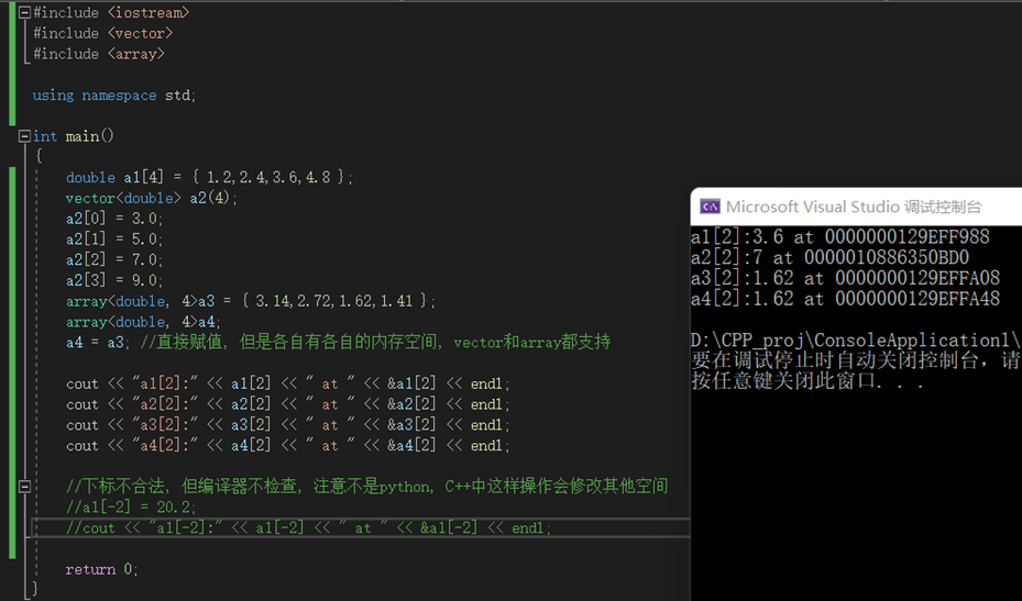 vector是一种动态数组,可以自动调整长度。 用法:包含头文件vector,定义时,需要指出数据类型和规模,规模可以是变量,不指出规模则规模为0;  array是效率高于vector的数组,但规模固定,array是C++11新增的类型。 用法:包含头文件array,定义时需要指出类型和规模,规模是常量。  array和vector相比普通数组的区别在于:array,vector支持整个对象的整体赋值,使用示例如下:
