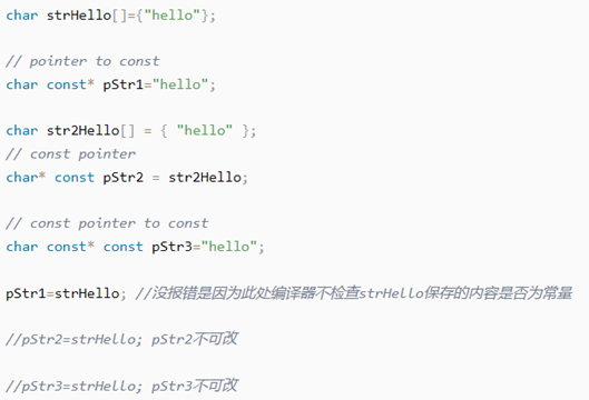 由于数组名是一个指针,所以C风格的字符串可以用一个指向字符的指针表示。通常我们定义指针指向字符串(这个char型数组),并用const限定该指针变量指向的字符串只读(限制我们不能通过指针修改该字符串中的字符);