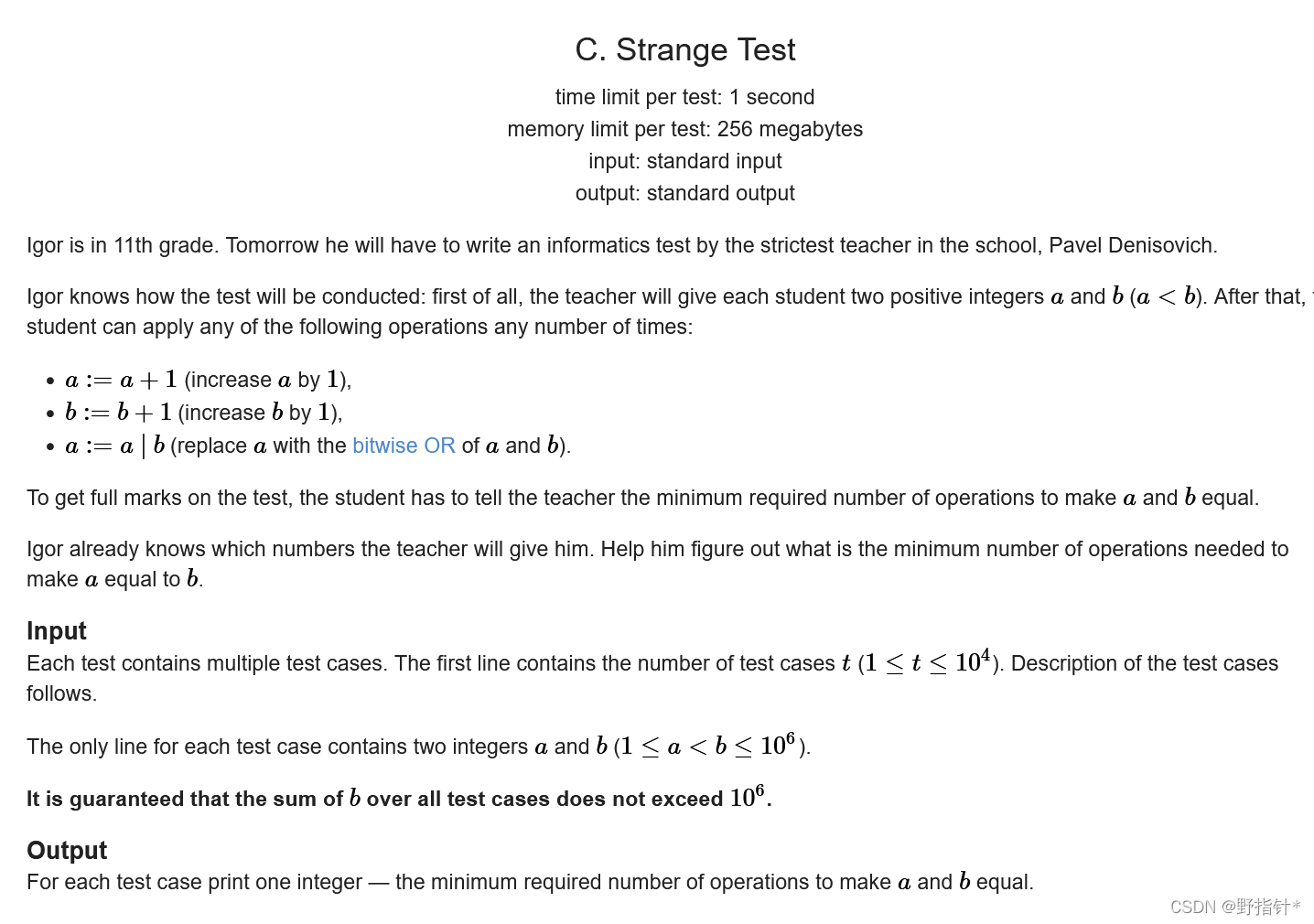 2.使用了第2个操作,假设使用这次操作时,a 和 b的值增大为a1, b1, 那么操作次数为a1 - a + b1 - b + 1 + (a1 | b1) - b1 = a1 + (a1 | b1) + 1 - a - b.由于1 - a - b是常数,所以我们要使得a1 + (a1 | b1)最小.两个变量,我们可以枚举一个变量a1,枚举过程中要满足以下条件:a1 < b, a1 < b1, b >= b1.