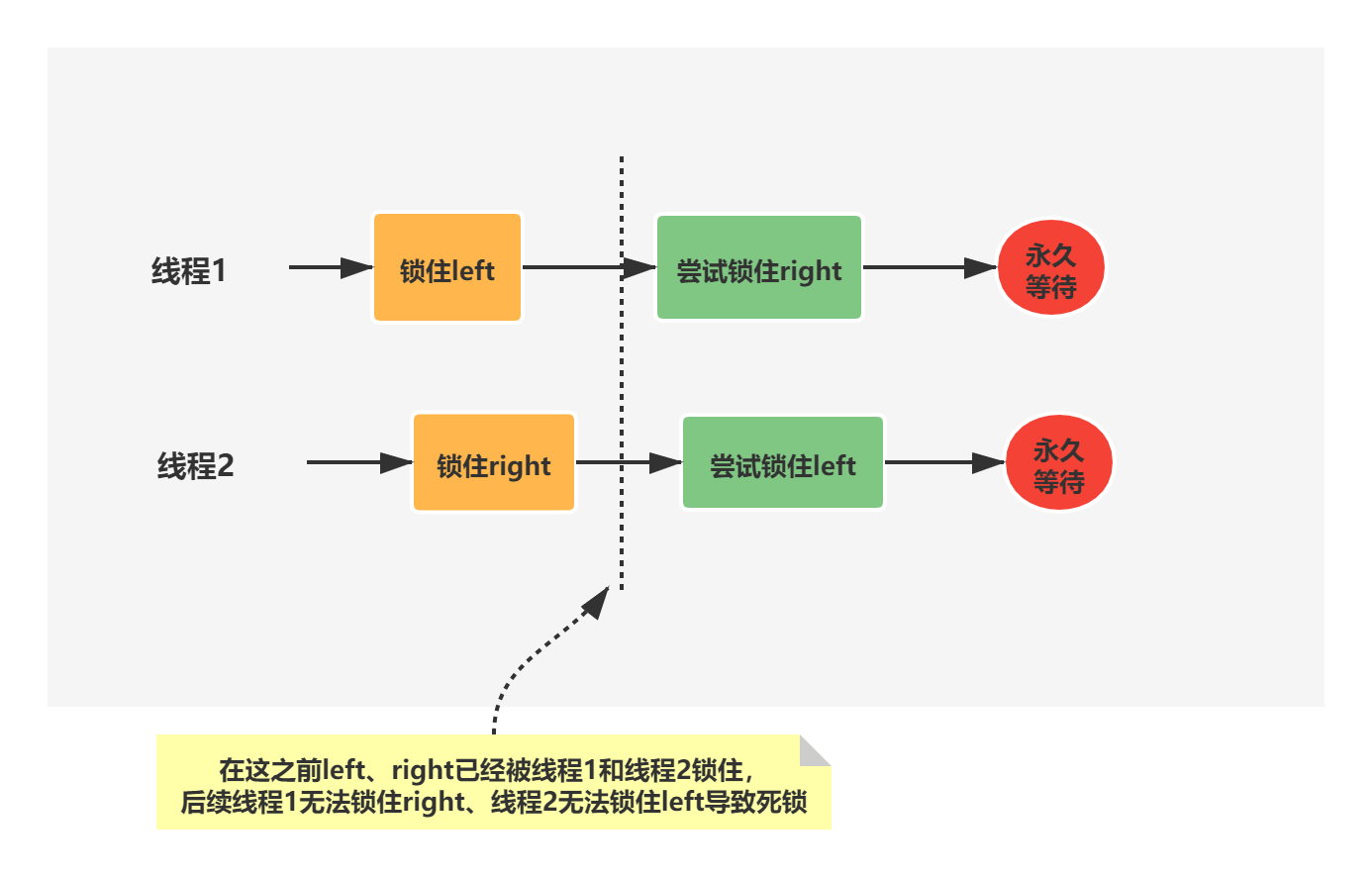 如上所示的这两种情况无法避免同时执行的情况,因此存在死锁的可能性,其执行流程如下: