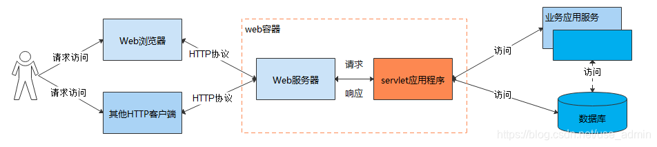 servlet就是一个java应用程序,实现了servletAPI规范的java应用程序就是一个servlet,主要是用来处理来自web浏览器或者其他HTTP客户端的请求,常常跟我们的业务程序或者我们的数据对接,相当于一个中间层的作用,动态地生成内容给服务器;要部署和运行servlet,需要使用web容器(servlet容器),web容器本质上就是与servlet交互的web服务器组件,web容器负责管理servlet的生命周期,将URL映射到特定的servlet(具体在web.xml中配置)并确保URL请求者具有正确的权限。如下图: