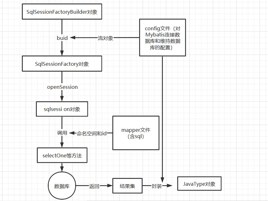 SqlSessionFactoryBuilder 根据Mybatis的config文件的流对象创建出一个sqlsession工厂对象,该对象调用openSession()方法得到sqlsession对象,sqlSession对象通过selectOne来选取方法,其中第一个参数是哪一个mapper文件的哪一个sql方法,定位标准是mapper文件的namespace的值和内部的sql方法的id值,第二个值是传递的参数,这样得到的是一个Object对象,强转成需要的对象类型,打印出来。  openSession()方法中如果传入true,则不需要自己提交事务,不写则默认需要自己提交事务,即sqlsession.commit()