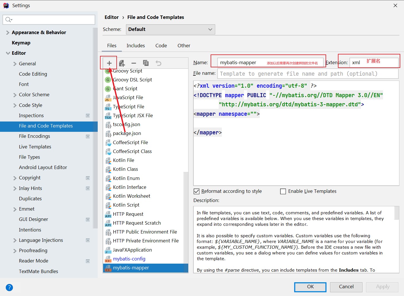 首先将mapper.xml内的代码复制,然后点击左上角File->Settings->Editor->File And Code Templates -