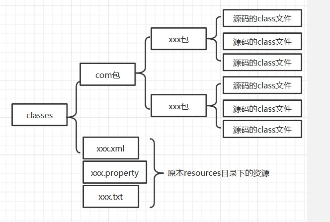 maven的目录结构 maven打包后classes目录结构为:  resources中的资源文件会被直接放到类路径的根路径下(与类代码同级)