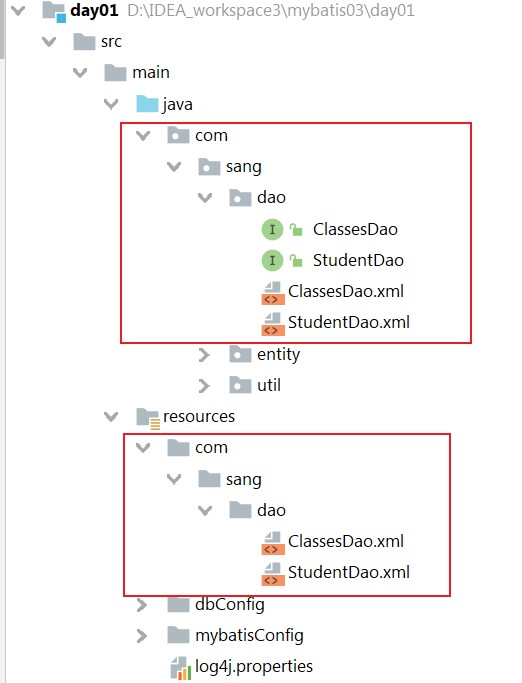 根据Maven的目录结构分析 我们可以将mapper文件的包结构和接口包结构设置成一样,也就是在resources目录下创建 与接口文件相同的文件夹 ,那么在生成的target目录中xml和接口文件就是在同一目录中了 如图: