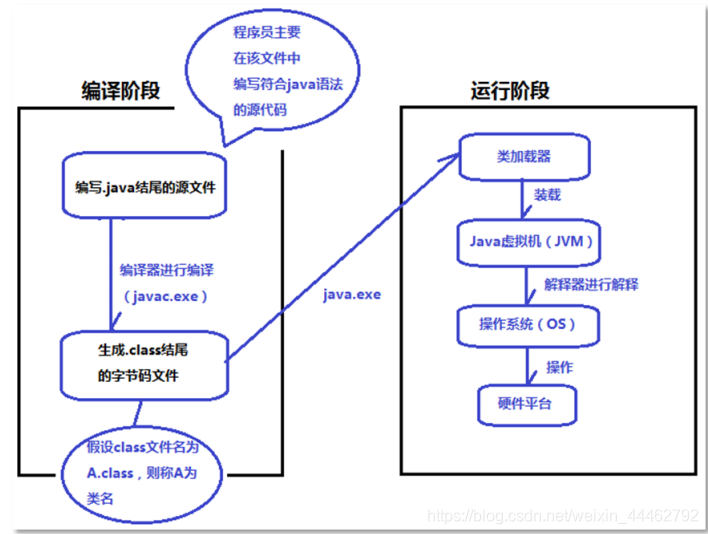 - 当编译阶段完成之后,我们可以使用 JRE 中的 java.exe 命令运行程序,例如执行命令 “java A”,该命令执行后会启动类加载器,类加载器去硬盘上搜索 A.class 文件,找到该字节 码文件之后,将其加载到 JVM 当中,JVM 中的解释器会将 A.class 字节码文件解释为操作系 统可以执行的二进制码,然后操作系统通过执行二进制码和硬件平台交互。