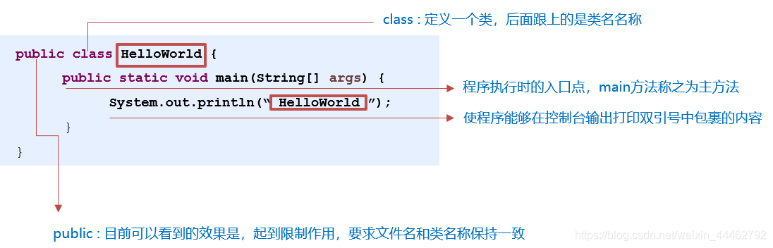 - 在 java 编程中,一定要注意成对儿的符号要成对儿写,以上 HelloWorld 当中成对 儿的符号包括:小括号(),中括号[],大括号{},双引号""。这些符号在编写的时候建议成对编写。