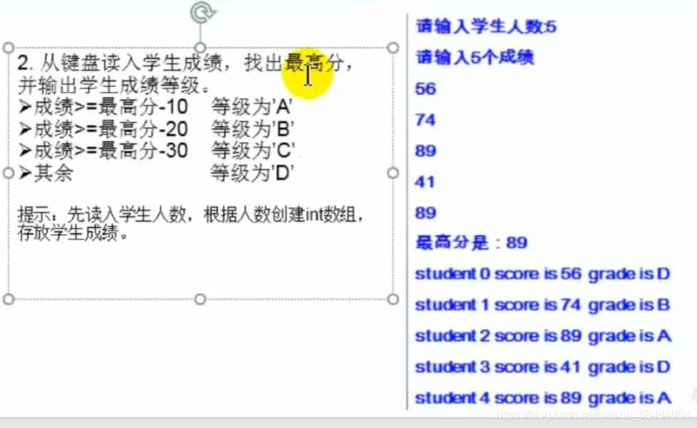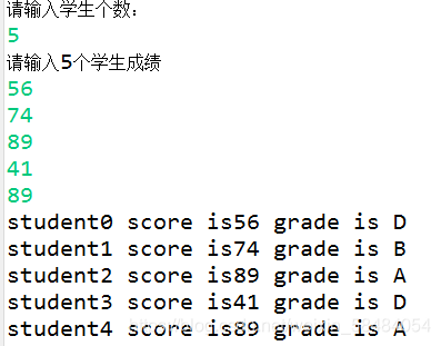 public class ArrayDemo01 { ?? ?public static void main(String[] args) { ?? ??? ?//1.使用Scanner读取学生个数 ?? ??? ?Scanner scan = new Scanner(System.in); ?? ??? ?System.out.println("请输入学生个数:"); ?? ??? ?int number = scan.nextInt(); ?? ??? ?//2.创建数组,存储学生成绩 ?? ??? ?int[] scores = new int[number]; ?? ??? ?//3.给数组元素赋值 ?? ??? ?int maxScore = 0; ?? ??? ?System.out.println("请输入" + number + "个学生成绩"); ?? ??? ?for (int i = 0; i < scores.length; i++) { ?? ??? ??? ?scores[i] = scan.nextInt();? ? ?? ??? ??? ?if(maxScore < scores[i]) { ?? ??? ??? ??? ?maxScore = scores[i]; ?? ??? ??? ?} ?? ??? ??? ? ?? ??? ?} ?? ??? ?char dengji; ?? ??? ?for (int i = 0; i < scores.length; i++) { ?? ??? ??? ?if(scores[i] >= maxScore - 10) { ?? ??? ??? ??? ?dengji = 'A'; ?? ??? ??? ?}else if(scores[i] >= maxScore - 20) { ?? ??? ??? ??? ?dengji = 'B'; ?? ??? ??? ?}else if(scores[i] >= maxScore - 30) { ?? ??? ??? ??? ?dengji = 'C'; ?? ??? ??? ?}else { ?? ??? ??? ??? ?dengji = 'D'; ?? ??? ??? ?} ?? ??? ??? ?System.out.println("student"+i+" score is" +scores[i]+" grade is "+ dengji); ?? ??? ?}?? ? ?? ??? ? ?? ?}