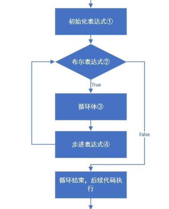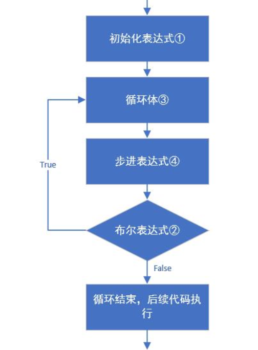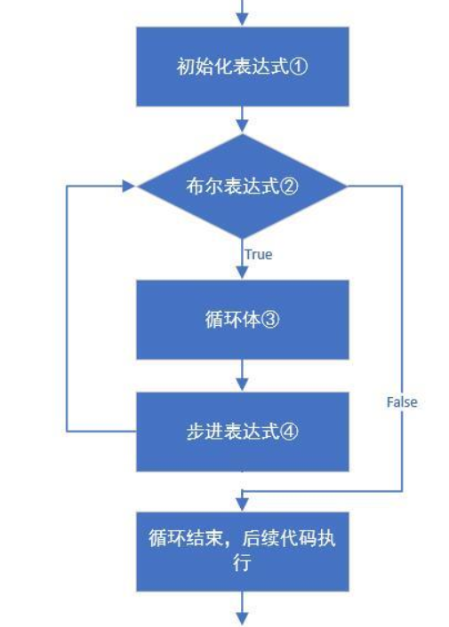 for(初始化表达式①; 布尔表达式②; 步进表达式④){